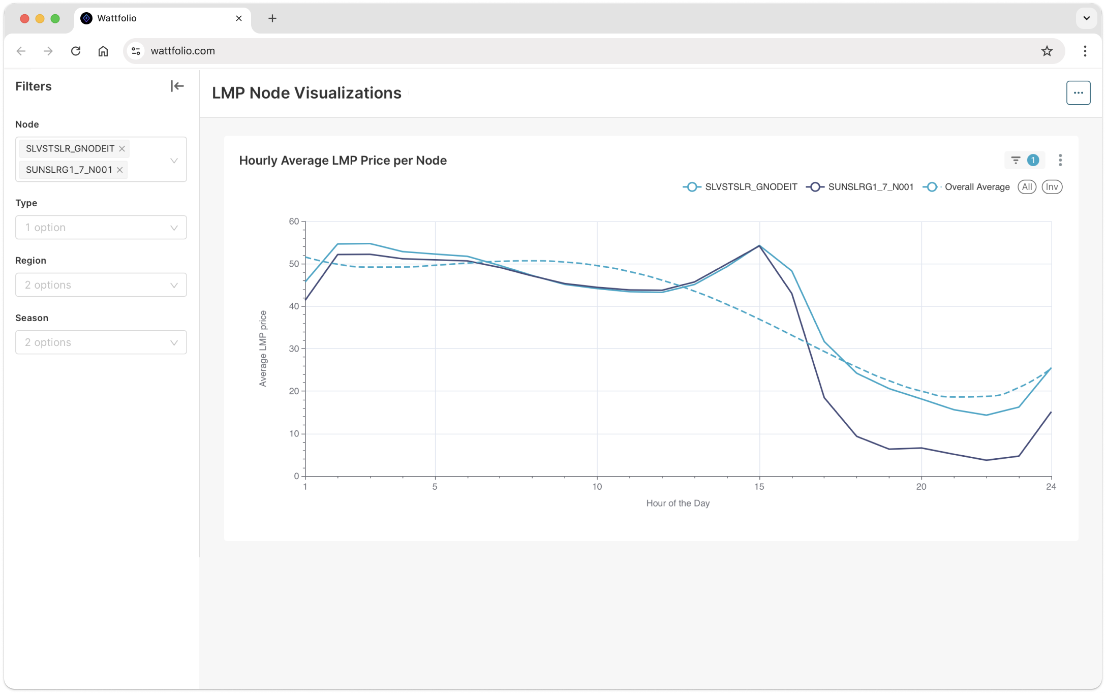 Our NodeScore tool provides valuable context to find an ideal project location by type of energy resource as well as measure a project’s performance against reference projects. Currently available for CAISO EIM resources, search by node and view the Wattfolio NodeScore (WNS) for the location as well as the performance by resource (such as the Solar WNS).
