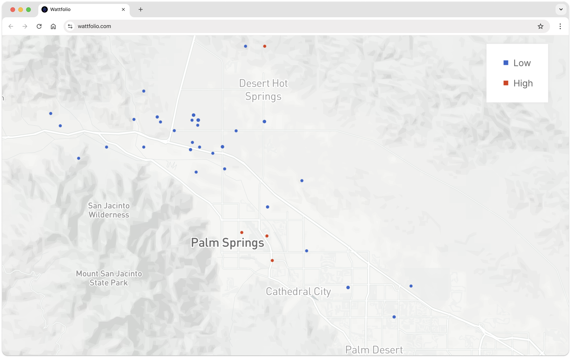 Wattfolio visualizes intelligent node scoring across regions, to help with scanning and understanding of the advantages and disadvantages of different locations. For example within Southern California, you could compare various Victorville-area nodes for solar use COTWDPGE_1_N001 (Solar NodeScore 84.5) against RDWAY_7_N002 (Solar NodeScore 78.84). Within Northern California, compare the Fresno area nodes for solar use BIOMSJCT_6_GN001 (Solar NodeScore 81.26) and KERMAN_6_N001 (Solar NodeScore 84.44).